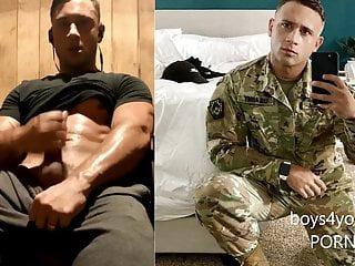 Ein muskulöser hübscher Soldat der eine fette Ladung aus seinen Nüssen schleudert